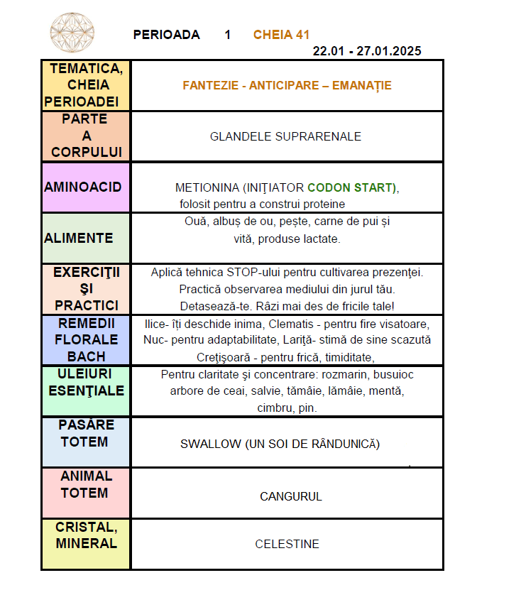 Recomandări terapeutice sincronizate cu Cheile Genelor. Ai mai jos un model pentru Cheia 41 activă zilele acestea, pâna pe 27 ianuarie.
