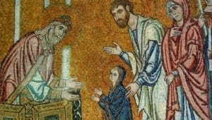 Parintii Nascatoarei de Dumnezeu Fecioara sunt Sfintii Parinti Ioachim si Ana. Acestia sunt cunoscuti pentru credinta arzatoare in Dumnezeu si pentru faptul ca erau lipsiti de copii. Deoarece viata lor nu era completa fara copii, se roaga la Dumnezeu sa primeasca si ei bucuria de a fi parinti, promitand ca in cazul in care vor avea un copil, acesta va fi dus la templu unde va fi inchinat Domnului. Ingerul li se arata si le vesteste ca vor avea o fata care va trebui sa poarte numele de Maria. Neuitand de promisiunea facuta in fata lui Dumnezeu, la trei ani de la nasterea Fecioarei Maria, Ioachim si Ana o duc pe fiica lor la templu.