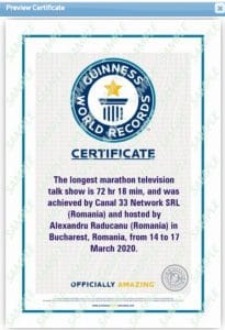 MARATONUL TALK-SHOW DE 73 ORE la Canal 33, din 14-17 martie 2020, a intrat în Cartea Recordurilor.